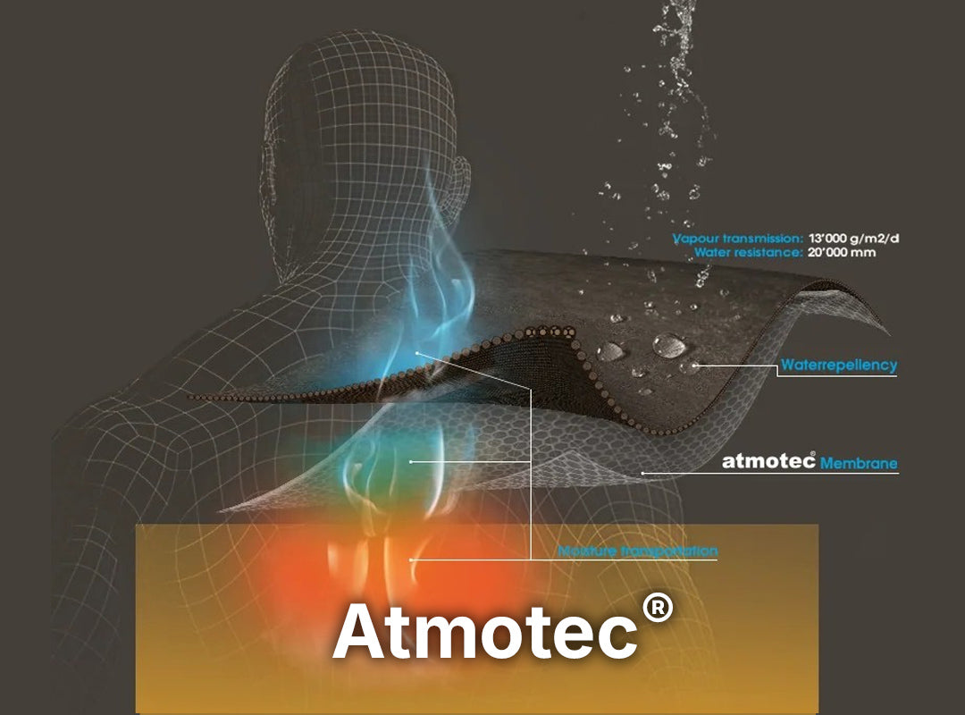 Atmotec® INSPIRA is a vapour permeable and waterproof TPU (Thermoplastic polyurethane) film bonded with the outer fabric. Thanks to the INSPIRA technology the film is half the thickness of the conventional membranes and three times more elastic and resistant to high pressure. This features puts Atmotec® INSPIRA amongst of the world's three most effective membranes in this category.